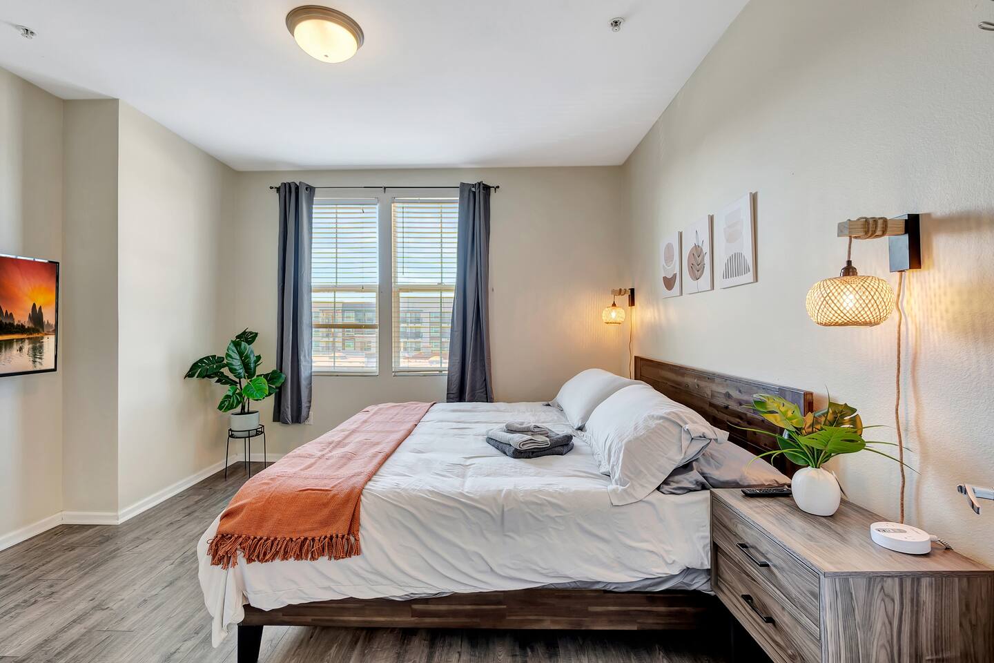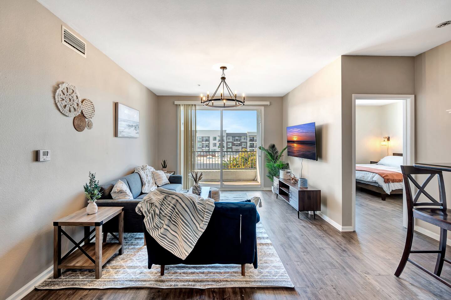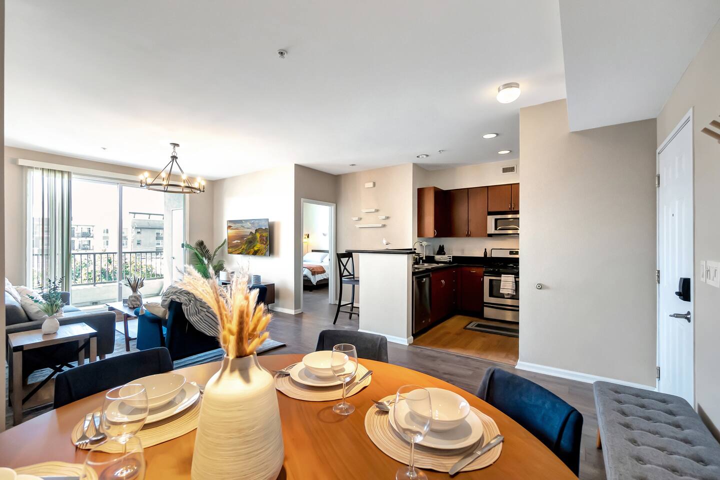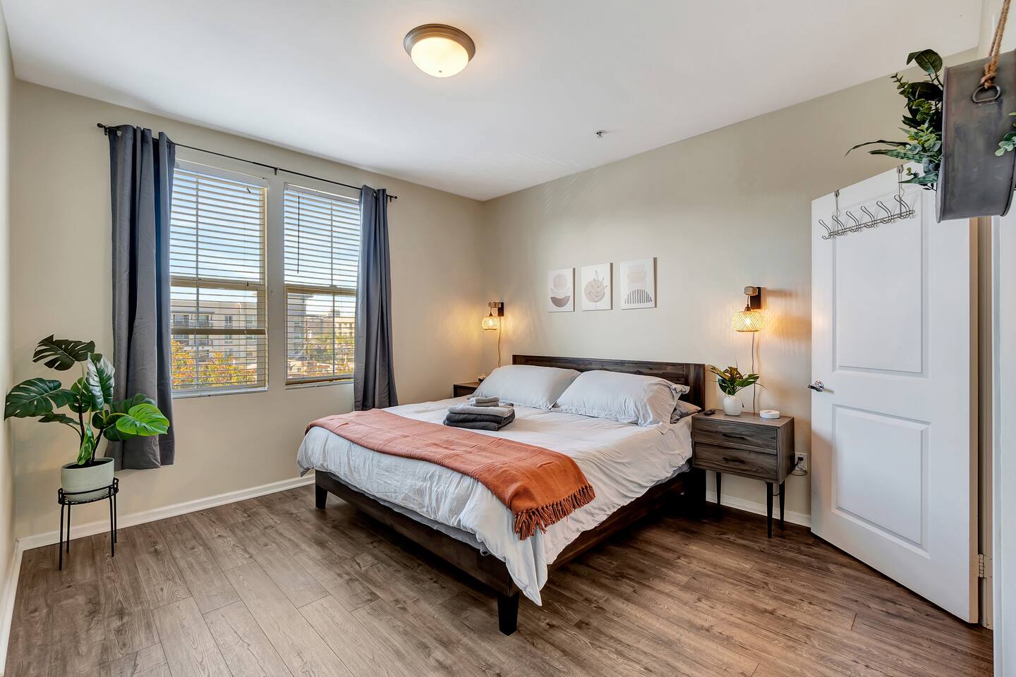 🌟 Location 🌟 🔹 Located in the vibrant Anaheim Platinum Triangle 🔹 5-10 minute drive to Disneyland, Knott’s Berry Farm, Garden Walk 🔹 Walking distance to Stadium, Honda Center, great restaurants, and several breweries 🔹 Safe area, gated community 🔹 On-site restaurants 🔹 Walking distance to restaurants, cafes, entertainment, banking, convenience stores 🔹 5 minute walk to McDonalds, Denny’s, Starbucks, Panera, Chipotle, Carl’s Jr 🔹 Public transit easily accessible nearby 🌟 The Home 🌟 🔹 Master bedroom King bed 🔹 Second bedroom with King bed 🔹 Sofa-bed in living room 🔹 Floor mattress for any room 🔹 Luxury mattress, memory foam, and regular plush pillows 🔹 2 Smart 4K TVs with Netflix, HBO, Paramount+, Prime Video, etc. 🔹 Modern and stylish decor 🔹 Quaint, private balcony for relaxation, watch Disneyland fireworks 🔹 Secure building, private entry 🌟 Kitchen and Dining 🌟 🔹 Fully equipped kitchen with extensive cookware, bakeware, utensils 🔹 Kid’s dinnerware (cups, bowls, plates, utensils) 🔹 Modern appliances - rice cooker, toaster, water heater, dishwasher, water filter, ice maker, oven, microwave 🔹 Coffee bar with Nespresso premium coffee machine 🔹 Coffee pods, creamer, sugar, sweetener, tea 🔹 French press coffee maker 🔹 Premium seasonings for all your cooking needs 🔹 Large modern dining table that comfortably seats 6 🌟 Resort-Style Amenities 🌟 🔹 Sparkling swimming pool, jacuzzi, and BBQ area 🔹 24-hour gym, sauna, and pool table in the game room 🔹 Free parking for two cars in gated garage 🔹 Central AC and heating 🔹 In-unit laundry/dryer Note: a lease agreement will need to be signed by each person in your group before check-in or the reservation may be cancelled.