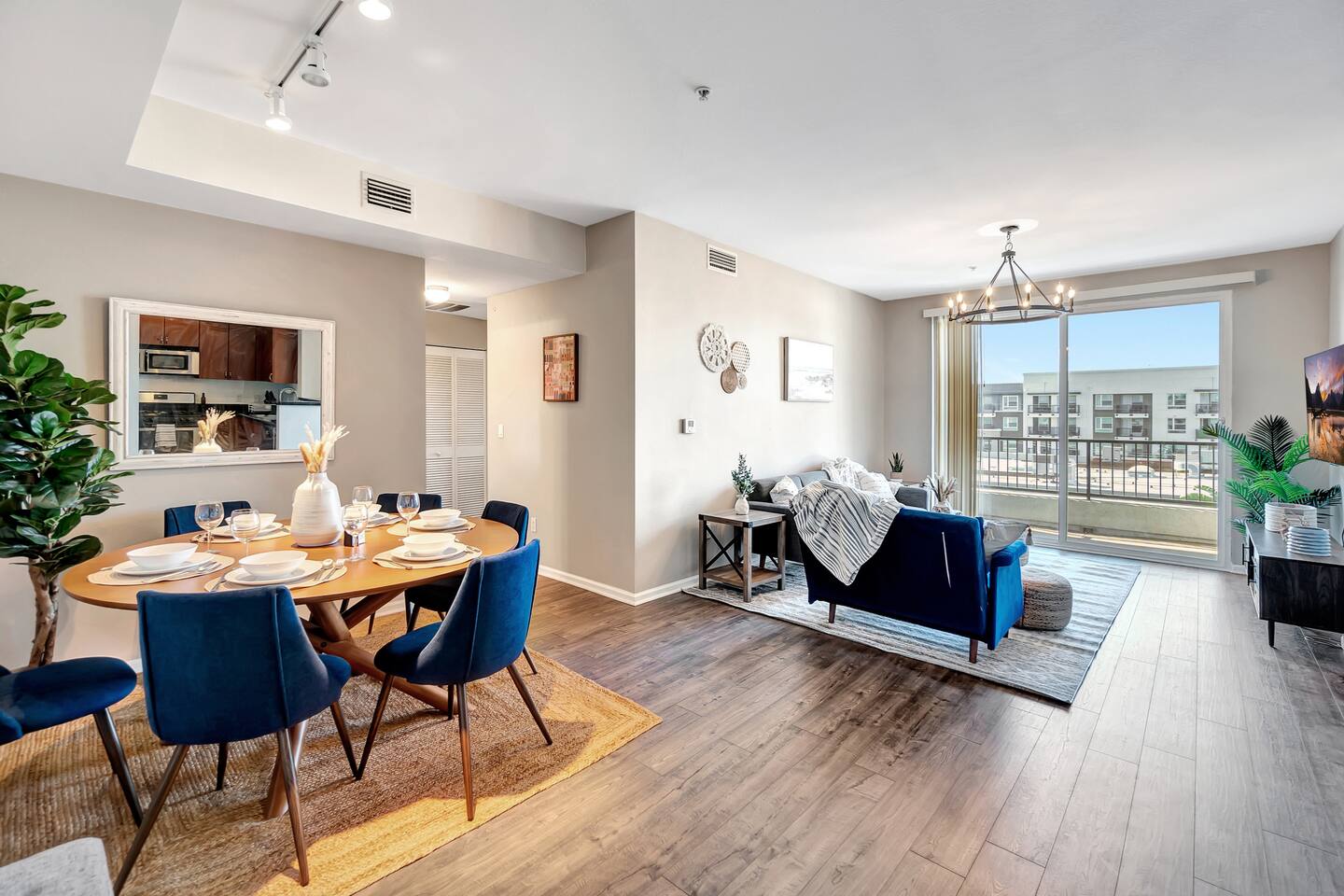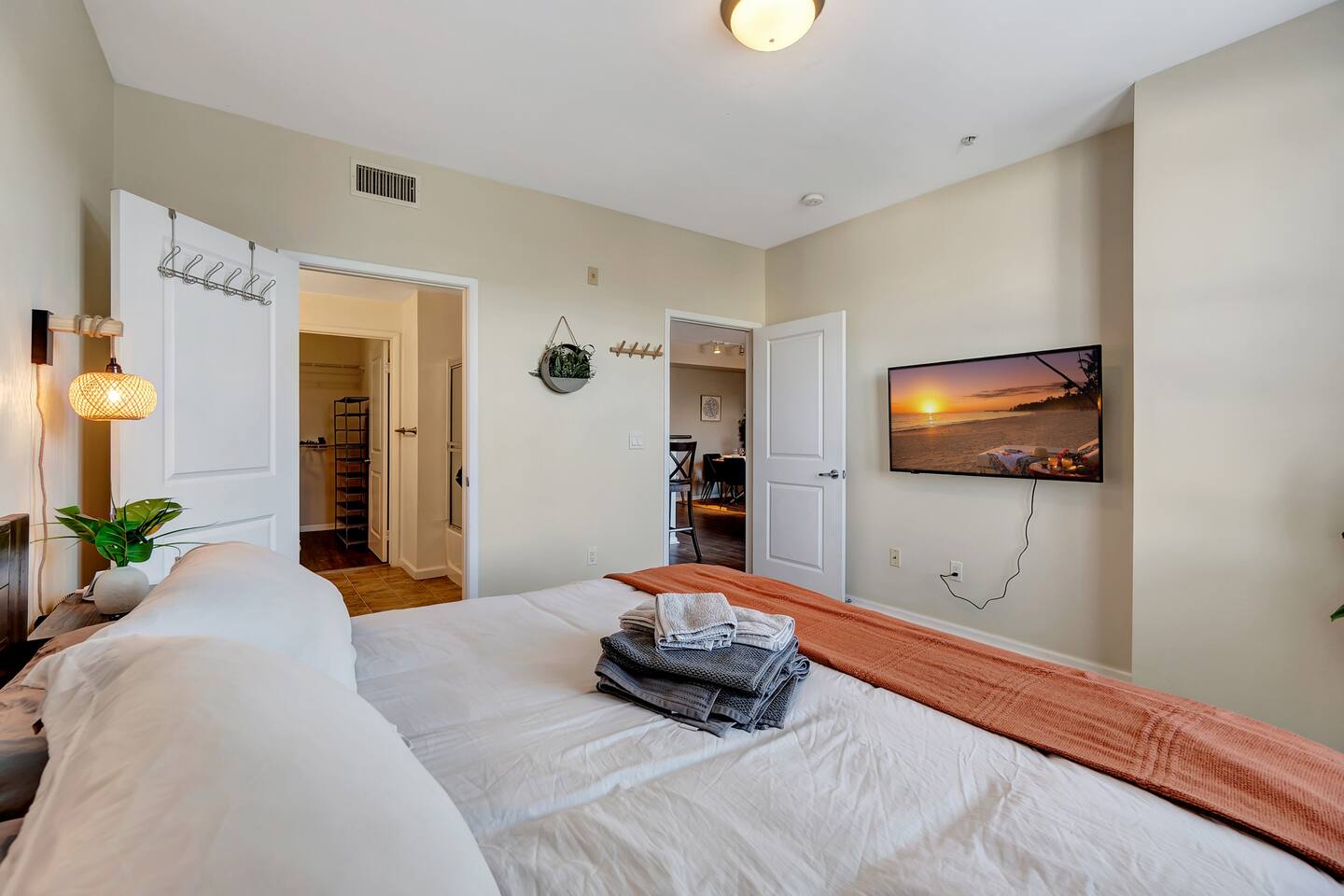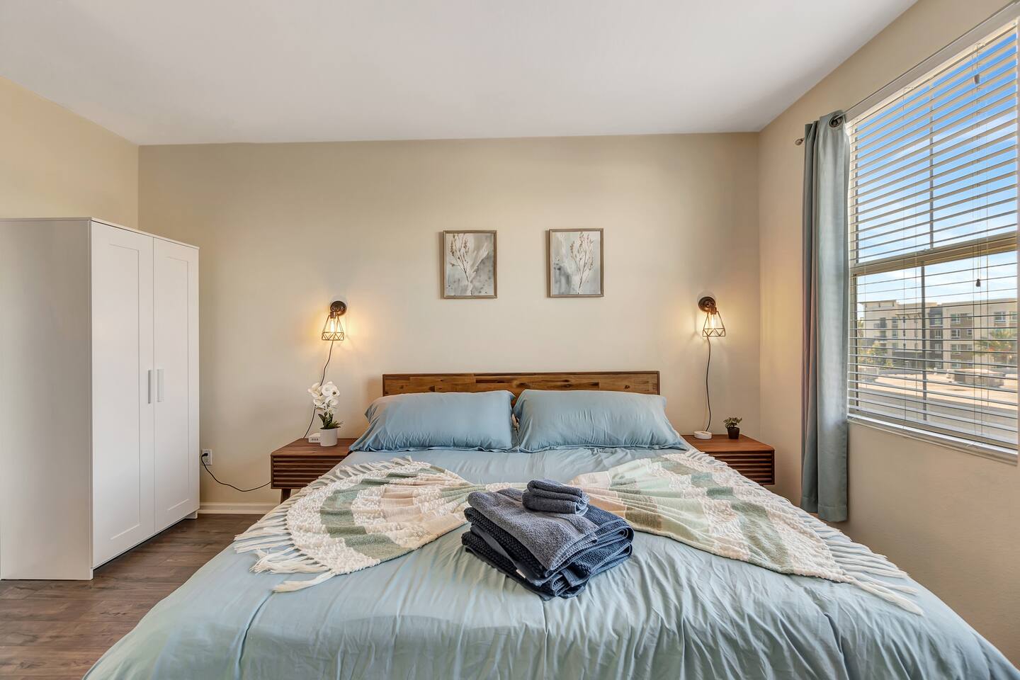 🌟 Location 🌟 🔹 Located in the vibrant Anaheim Platinum Triangle 🔹 5-10 minute drive to Disneyland, Knott’s Berry Farm, Garden Walk 🔹 Walking distance to Stadium, Honda Center, great restaurants, and several breweries 🔹 Safe area, gated community 🔹 On-site restaurants 🔹 Walking distance to restaurants, cafes, entertainment, banking, convenience stores 🔹 5 minute walk to McDonalds, Denny’s, Starbucks, Panera, Chipotle, Carl’s Jr 🔹 Public transit easily accessible nearby 🌟 The Home 🌟 🔹 Master bedroom King bed 🔹 Second bedroom with King bed 🔹 Sofa-bed in living room 🔹 Floor mattress for any room 🔹 Luxury mattress, memory foam, and regular plush pillows 🔹 2 Smart 4K TVs with Netflix, HBO, Paramount+, Prime Video, etc. 🔹 Modern and stylish decor 🔹 Quaint, private balcony for relaxation, watch Disneyland fireworks 🔹 Secure building, private entry 🌟 Kitchen and Dining 🌟 🔹 Fully equipped kitchen with extensive cookware, bakeware, utensils 🔹 Kid’s dinnerware (cups, bowls, plates, utensils) 🔹 Modern appliances - rice cooker, toaster, water heater, dishwasher, water filter, ice maker, oven, microwave 🔹 Coffee bar with Nespresso premium coffee machine 🔹 Coffee pods, creamer, sugar, sweetener, tea 🔹 French press coffee maker 🔹 Premium seasonings for all your cooking needs 🔹 Large modern dining table that comfortably seats 6 🌟 Resort-Style Amenities 🌟 🔹 Sparkling swimming pool, jacuzzi, and BBQ area 🔹 24-hour gym, sauna, and pool table in the game room 🔹 Free parking for two cars in gated garage 🔹 Central AC and heating 🔹 In-unit laundry/dryer Note: a lease agreement will need to be signed by each person in your group before check-in or the reservation may be cancelled.